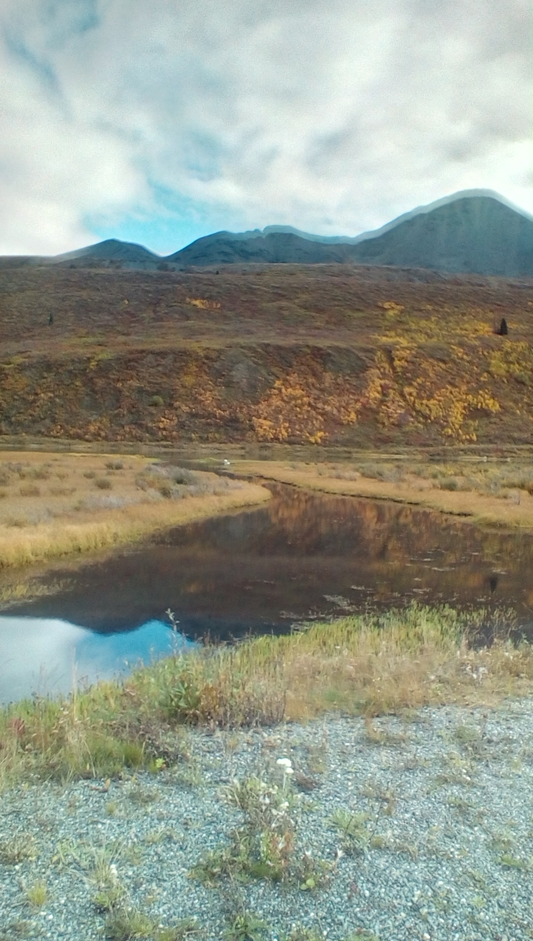 I don’t want this post to be a weather report about sunshine and the cloud cover we drove under before the approach to Three Guardsmen Pass. But just out of Haines Junction we did enjoy sunlight sparking on masses of yellow poplar leaves and later on a swan pair that seemed to enjoy its warmth while resting on the waters of a pocket lake. We could see the beauty under clouds but the sun enhanced it.