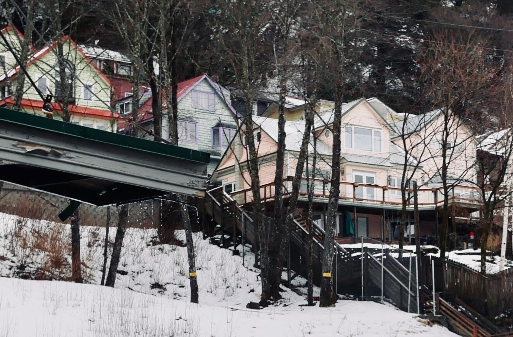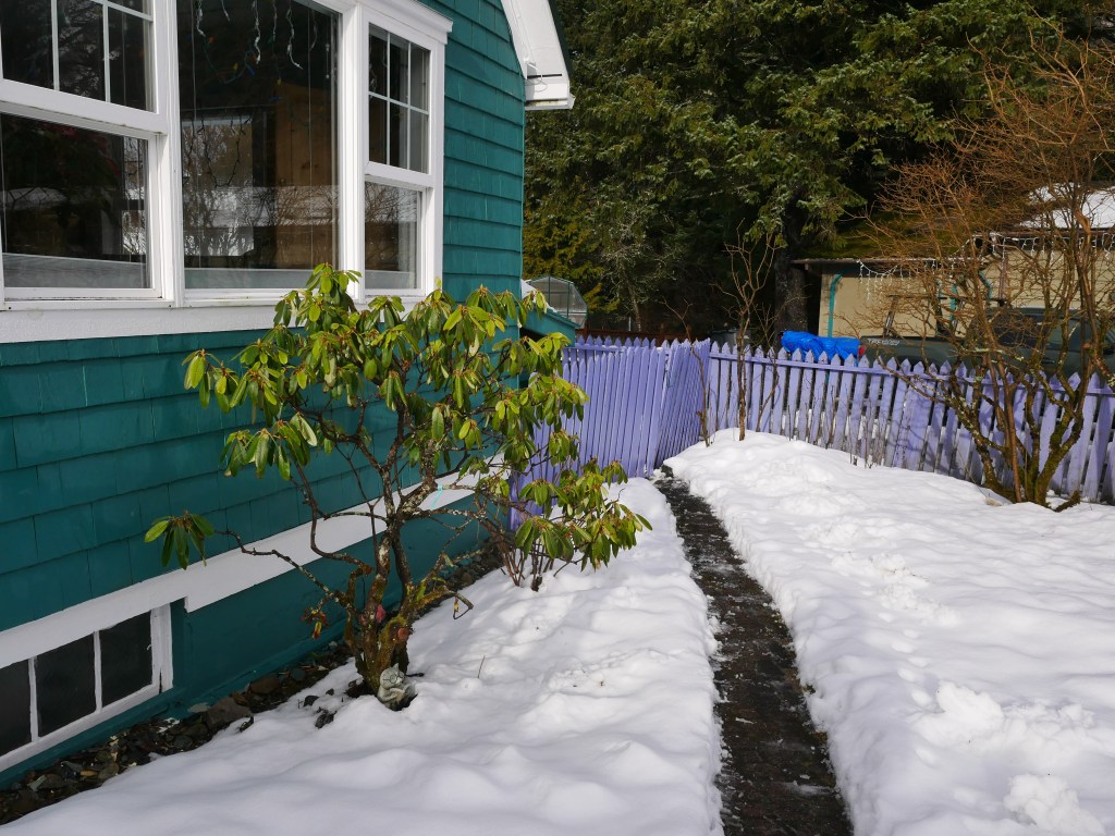 Wet snow mixed with rain has been falling on Aki and I for a week. Even she has been acting grumpy. That’s why I got excited when the Juneau weatherman predicted an hour of dry weather this morning. Aki, who can’t speak or understand English, acted like she didn’t trust me. Still, she let me dress her for a walk.