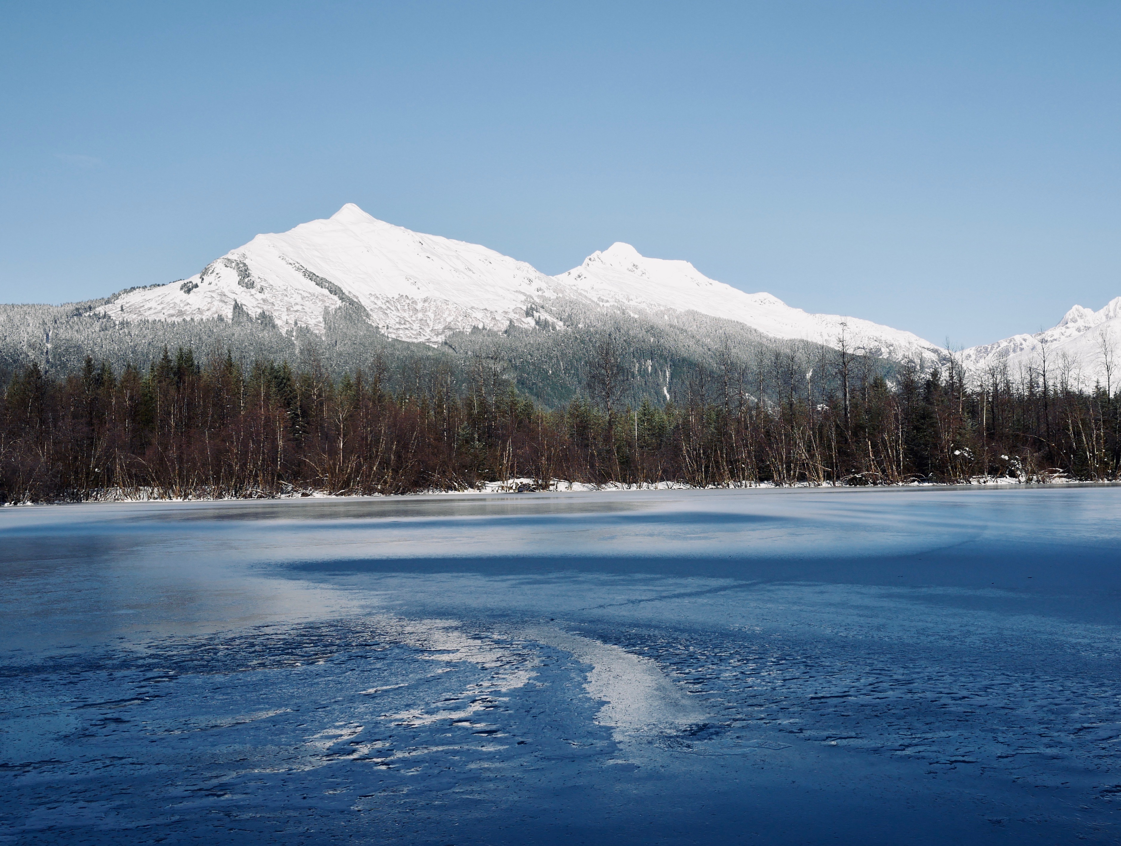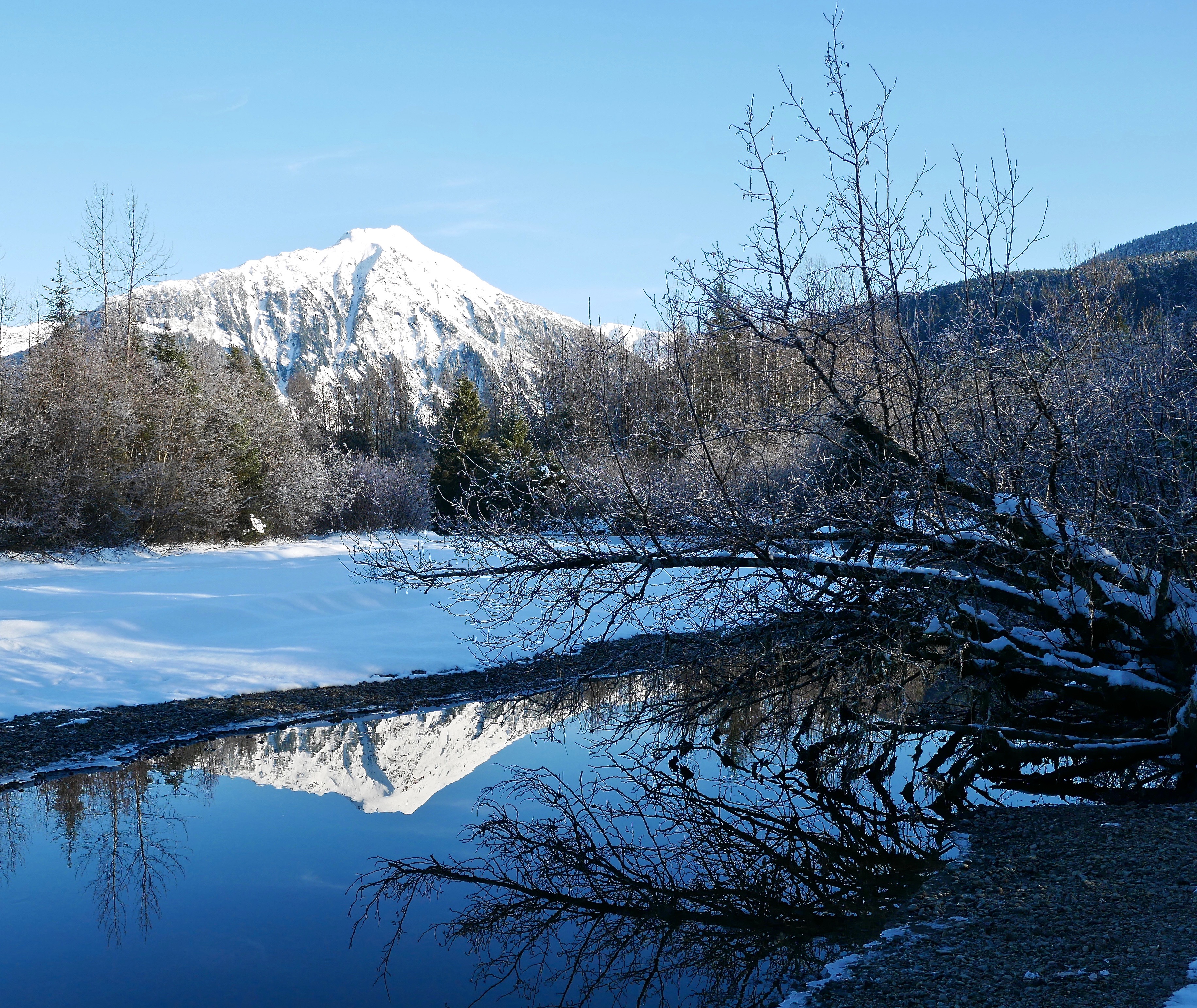 We drove to the Rain Forest trailhead and made our way down the icy trail. It led up to an open patch of ocean which was being used by a humpback whale to feed. The whale moved past a large black mass shaped like a very large ball. The incoming tide carried it up channel at about the same speed as the whale. I wondered whether it once was another whale, maybe an orca, now floating dead weight on the tide.